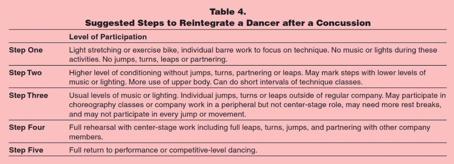 - Russell, J. A., McIntyre, L., Stewart, L., & Wang, T. (2021). Concussions in Dancers and Other Performing Artists. Physical medicine and rehabilitation clinics of North America, 32(1), 155–168.
